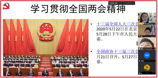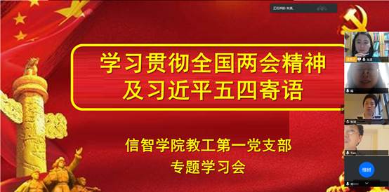5月30日,伟德官网教工第一党支部召开“学习贯彻全国两会精神及五四寄语”专题会议。会议由支部书记朱凌主持,学院党委副书记田聪、支部委员章华、刘维树、及在国内外的支部党员老师们共同与会学习。