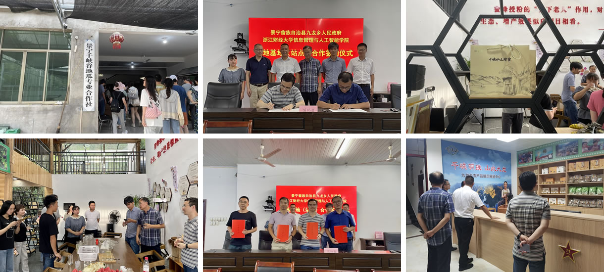 服务团随后来到了大山深处的景宁县九龙乡。该乡因滩坑水电站移民而建,耕地和工业资源相当匮乏,但环境优美、旅游资源丰富,是浙江省乃至全国生态环境最好的区域之一,而当地的番薯面、蜂蜜等特色农产品品质卓越,近几年在与直播电商结合后,也给当地居民带来了不少的收益。在参观了几家典型的企业之后,服务团前往九龙乡人民政府,与乡党委书记、乡长进行座谈,分析了当前九龙乡电商发展的瓶颈和机遇,并提出了后续发展的建议。“这里的自然资源丰富、环境优美,特色产品也很好,但还是缺乏品牌运作,如果结合千峡湖、九龙山或滩坑电站等地标,利用社交平台、电商直播平台和短视频平台等进行全方位宣传,一定能有更好的效果,在这些方面我们可以有更多的合作”。姚建荣教授在座谈会上说。会后举行了院地合作共建实践基地的签约仪式和人才聘任仪式。