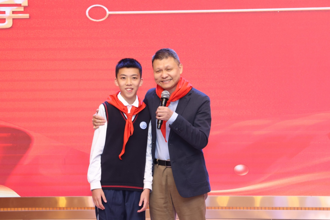 从少先队大队长上台为他戴上红领巾那一刻,张文宇的言行举止就特别暖心,只见他搂着小朋友的胳膊,笑眯着眼,请大家多拍照。看小朋友有点小紧张,他就故意逗小朋友:“这张照片我有用的哦,若干年之后我会拿出去吹牛的,我认识这个小朋友。好好学习,国家未来靠你了!”随意调侃的一句话,使小朋友一下子露出了阳光灿烂的笑脸,相信这肯定能激起这位小朋友以老学长为榜样、长江后浪推前浪的决心。小朋友亮晶晶的大眼睛与张文宇笑眯了的小眼睛组合成了一张极为风趣和温馨的画面。