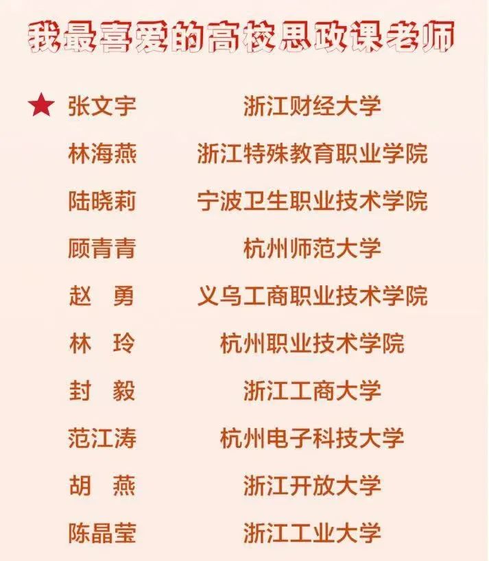 近日,中共浙江省委宣传部、中共浙江省委网信办、浙江省教育厅公布了第三届“思政星课堂”——我最喜爱的思政课老师推介宣传活动获奖名单。在学校推荐、学生推荐和老师自荐的基础上,经专家评审、网络投票等环节,张文宇等10位老师被评为“我最喜爱的高校思政课老师”、林玮等10位老师被评为“高校优秀思政课老师”。