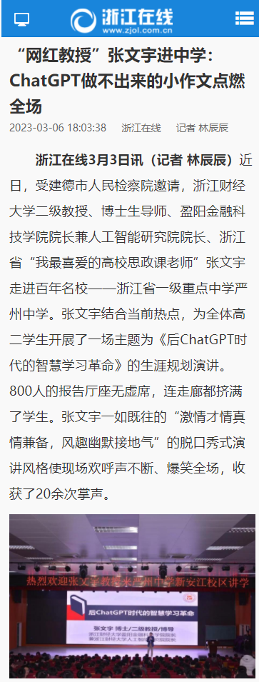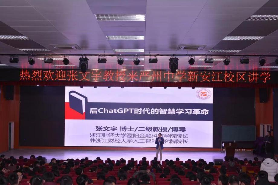近日,受建德市人民检察院邀请,BV伟德官方网站二级教授、博士生导师、盈阳金融科技学院院长兼人工智能研究院院长、浙江省“我最喜爱的高校思政课老师”张文宇走进百年名校——浙江省一级重点中学严州中学。张文宇结合当前热点,为全体高二学生开展了一场主题为《后ChatGPT时代的智慧学习革命》的生涯规划演讲。800人的报告厅座无虚席,连走廊都挤满了学生。张文宇一如既往的“激情才情真情兼备,风趣幽默接地气”的脱口秀式演讲风格使现场欢呼声不断、爆笑全场,收获了20余次掌声。