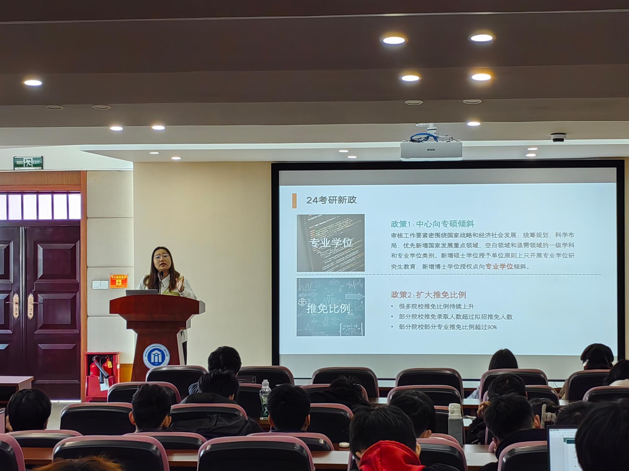 讲座内容围绕考研备考底层逻辑以及初试复试该如何准备两大板块展开。张斓曦老师用生动有趣的语句分享了自己的考学经历,讲述了她是如何从一个本科医学生转战为一名考研英语老师,鼓励同学们要从人生历程不断反思成长,不断总结调整,以更好面对未来的机遇和挑战。同时分享了最新的考研政策,提醒同学们当下考研人群基数仍然较大,建议学生们考研准备时间要有计划地进行提前。张斓曦老师还通过考研基本知识、院校选择和初试复试三方面进行了分享,她提出,要提早准备英语方面的知识,建议大家多次参加四六级考试以丰富英语备考的经验。最后,张老师强调了备考计划的重要性和备考时间的紧迫性,希望同学们把握时间节点,科学扎实备考。