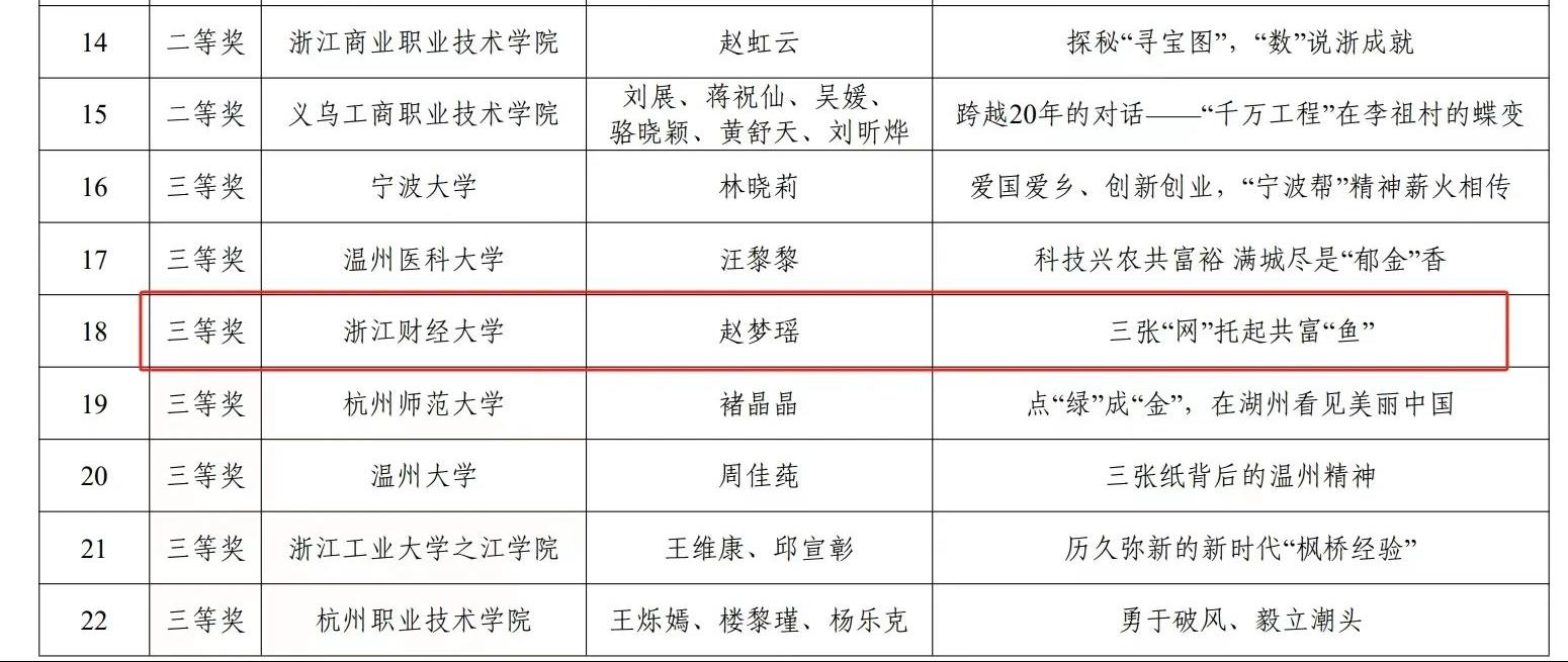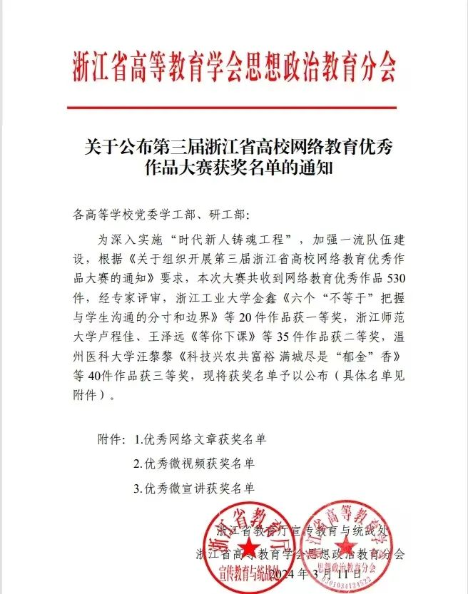 近日,由浙江省教育厅宣传教育处、浙江省高等教育学会思想政治教育研究分会组织开展的第三届浙江省高校网络教育优秀作品大赛获奖名单公布,伟德官网思政辅导员赵梦瑶的作品《三张“网”托起共富“鱼”》荣获优秀微宣讲三等奖。