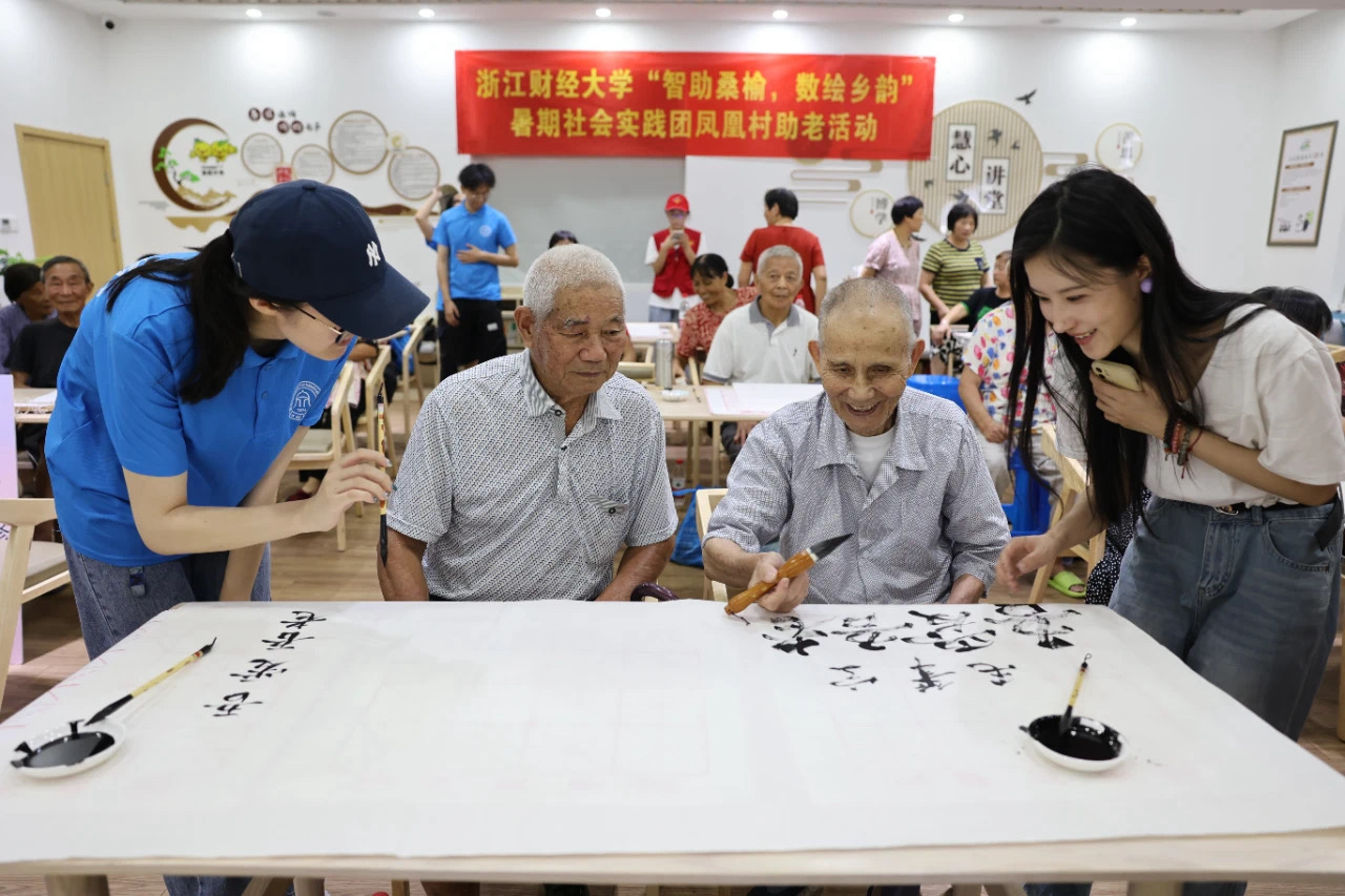 李金昌一行首先来到凤凰村颐乐养中心活动室,现场观摩了实践团开展的助老活动。毛笔字、漆扇、智能手机使用指导、AI修复老照片、防诈宣讲、健康讲堂......现场活动类型丰富,气氛欢乐而热烈。