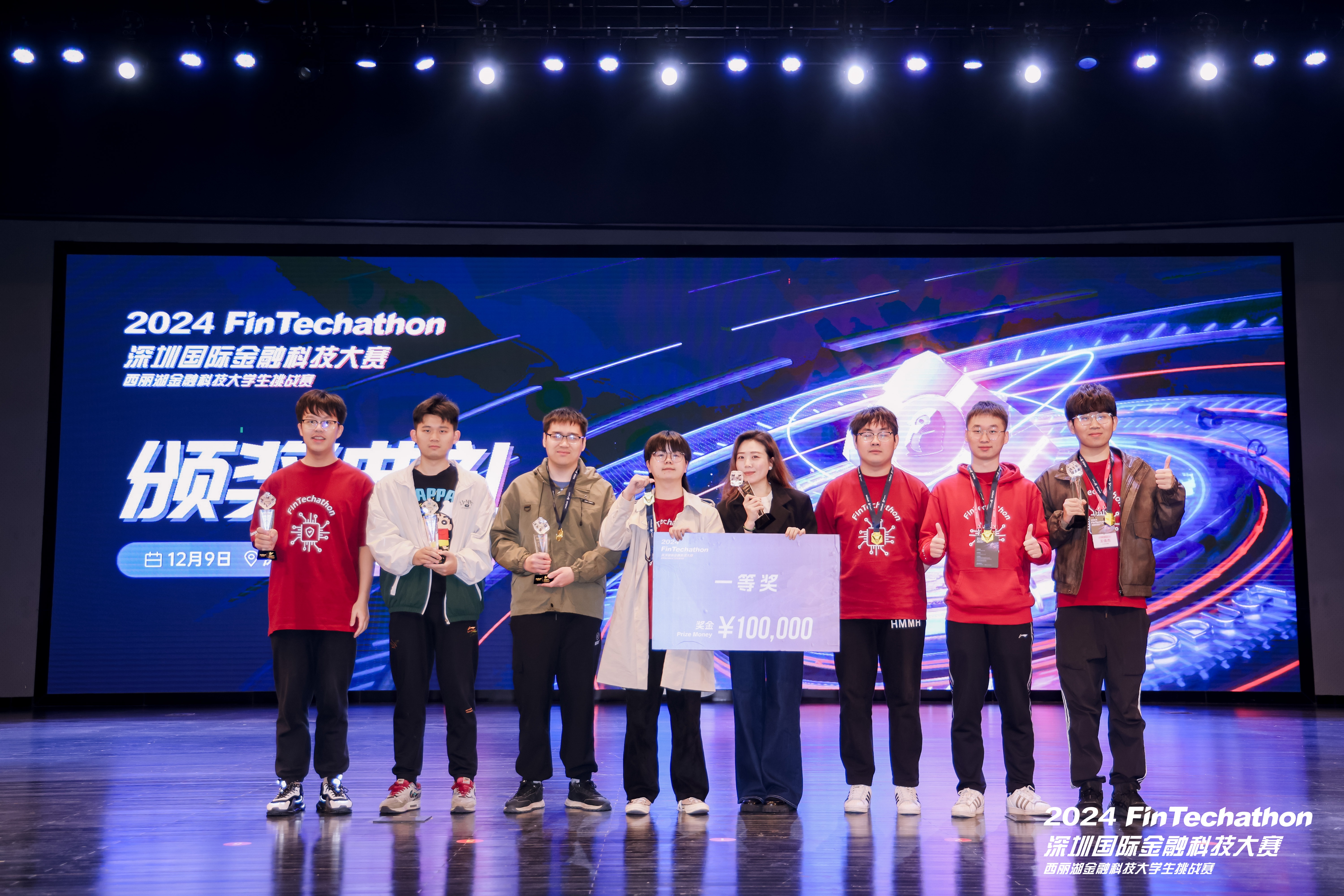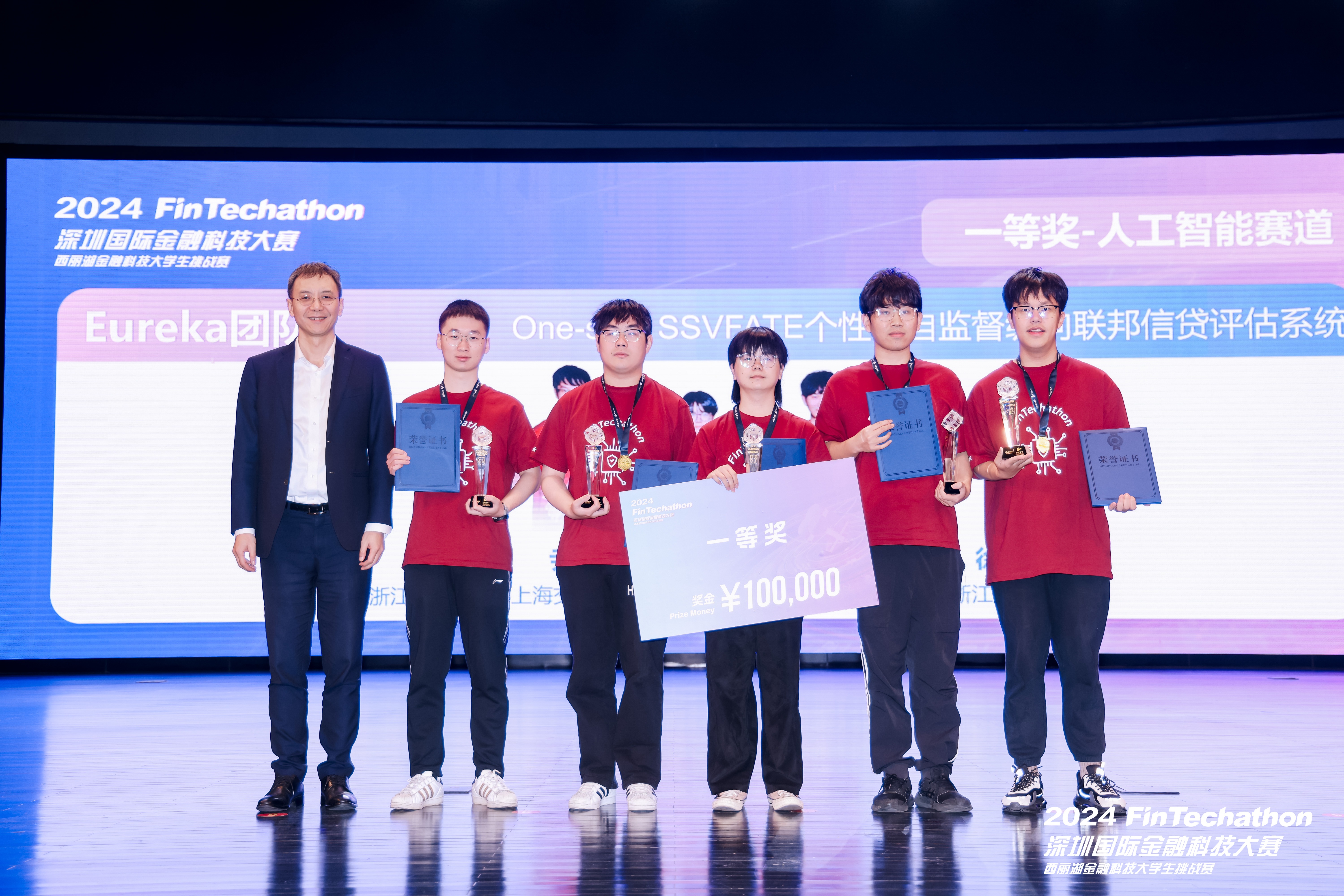 2024年12月9日,由深圳市地方金融管理局战略指导,深圳大学、微众银行和深圳香蜜湖国际金融科技研究院联合主办的2024 FinTechathon 深圳国际金融科技大赛在深圳大学丽湖校区圆满落幕。经过数月的激烈角逐,我校伟德官网两支队伍成功入围人工智能赛道十强,并在决赛中表现优异,其中一支队伍勇夺桂冠并获得10万元奖金。