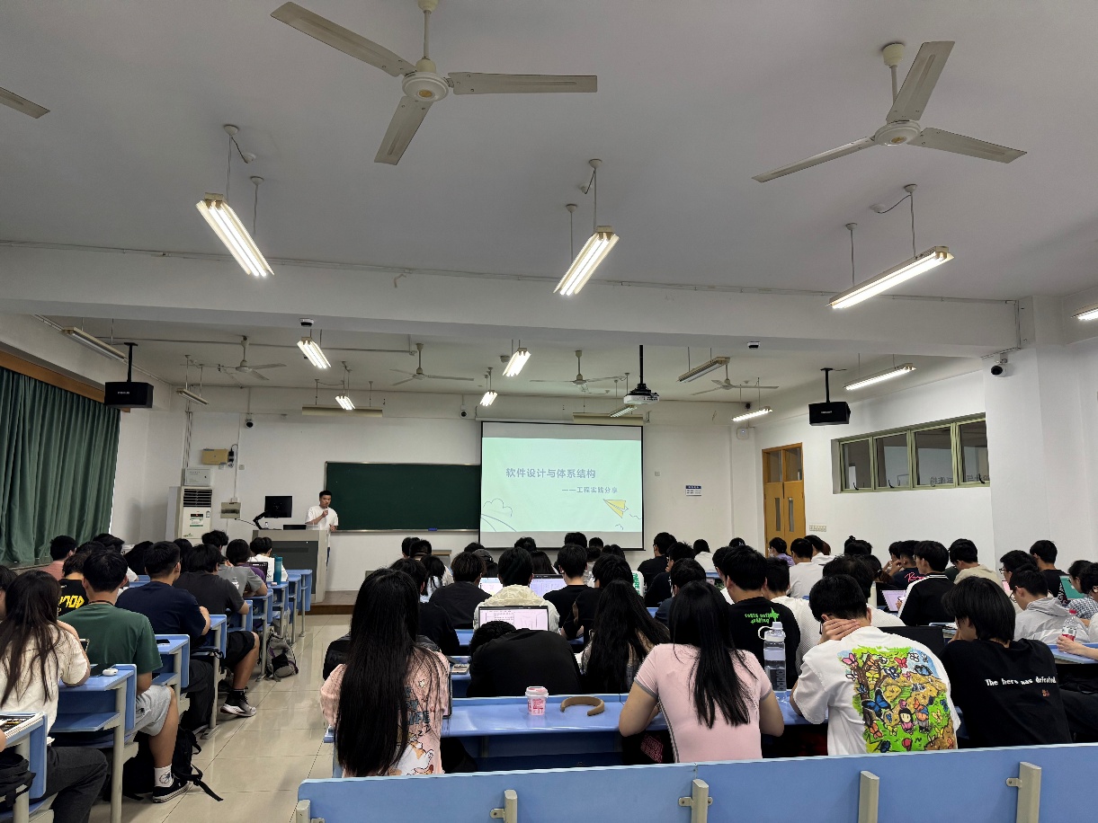 课程开始前,彭老师围绕课程学习现状、实践与理论的关联、企业实践需求与教学介入三个方面展开前期调研,调研数据为本次课程安排和后续课程优化提供了有效依据。基于调研结论,孔老师结合自身经历,从课程回顾、工程案例实践、校园与企业项目差异、求职及考研经历等方面进行细致分享。他着重介绍企业软件系统研发的项目周期与角色协作,并以AI问诊案例,深入讲解需求分析、方案设计、整体设计、详细设计等环节。随后,从代码功能实现角度,通过“拆分代码Bug”“服务器宕机”“流量暴增”“恶意攻击”“大数相乘”5个场景,比较分析校园知识与企业实践的异同。课堂上,学生们认真听讲,不少同学认真记录,积极与孔老师互动。课后反馈显示,同学们对课程中抽象的理论知识理解更加透彻,也掌握了许多实用的工程实践技巧,此次分享有效填补了同学们对企业真实开发场景认知的空白,为后续《软件设计与体系结构》课程的学习打下了坚实的实践基础,也让课程内容与企业实际需求的结合更为紧密。