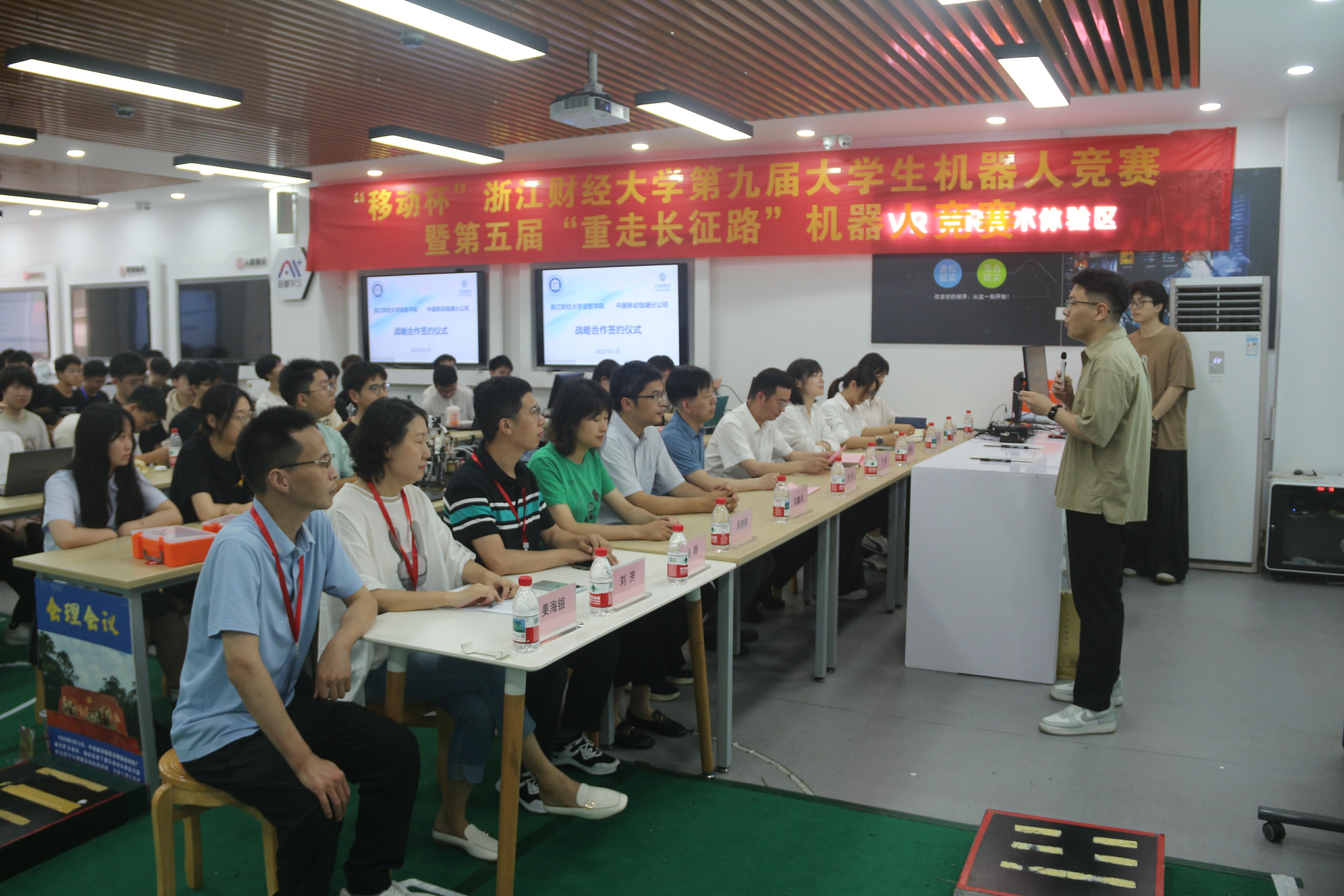 学院探索建设“AI+党建”的“12345”党建领航凝心工程,学院教工第一党支部获评校级先进基层党组织,课堂教学深受学生喜爱的教师张后旗、陈琰宏荣获校级优秀共产党员。学院教工第二党支部与物产中大国际贸易集团第一党支部开展党建共建活动,张帅院长为公司员工作了人工智能专题讲座。教工第三党支部赴浙江省博物馆与浙江省非物质文化遗产馆开展“之江书海淬党心,铜鉴湖畔筑匠魂”主题共建活动。学生党支部组织师生赴网营科技开展“党建共建,协同育人”活动,精准对接学生职业能力与产业需求;联合移动钱塘分公司举办“重走长征路”红色主题机器人竞赛,共同推动技术创新与人才培养,实现校企党建业务深度融合。