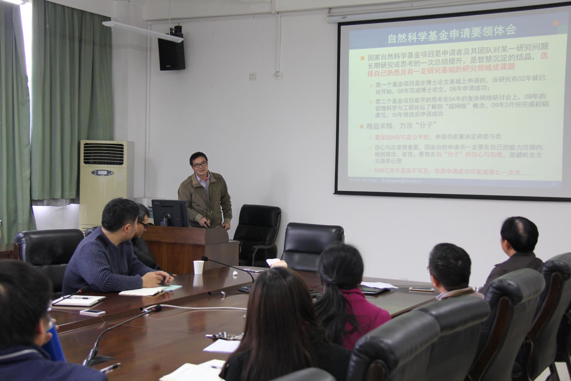 为进一步推动伟德官网教师对国家自然科学基金项目申报的热情,提高科研项目申报的命中率,学院于11月10日下午14:00在学院楼404会议室举行了2017年国家自然科学基金申报动员、辅导会。浙江理工大学经济管理学院副院长潘旭伟教授应邀以“自然科学基金项目申请体会与提纲解析”为主题分享了国家自然科学基金的申报经验。学院及兄弟学院约20名科研骨干教师参加了本次动员、辅导会。