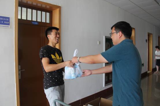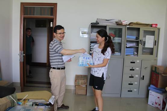 为了给坚守岗位的学院教职工送去关心和慰问,学院工会准备了防暑降温饮品。7月17日上午,学院党委副书记、工会主席陆颋浩老师,副院长陈远高老师来到各实验室和办公室,给顶着炎炎酷暑、坚守岗位的各专业实践指导老师、办公室值班老师送去一份清凉,向奋战在一线的老师们表示亲切的问候和衷心的感谢。