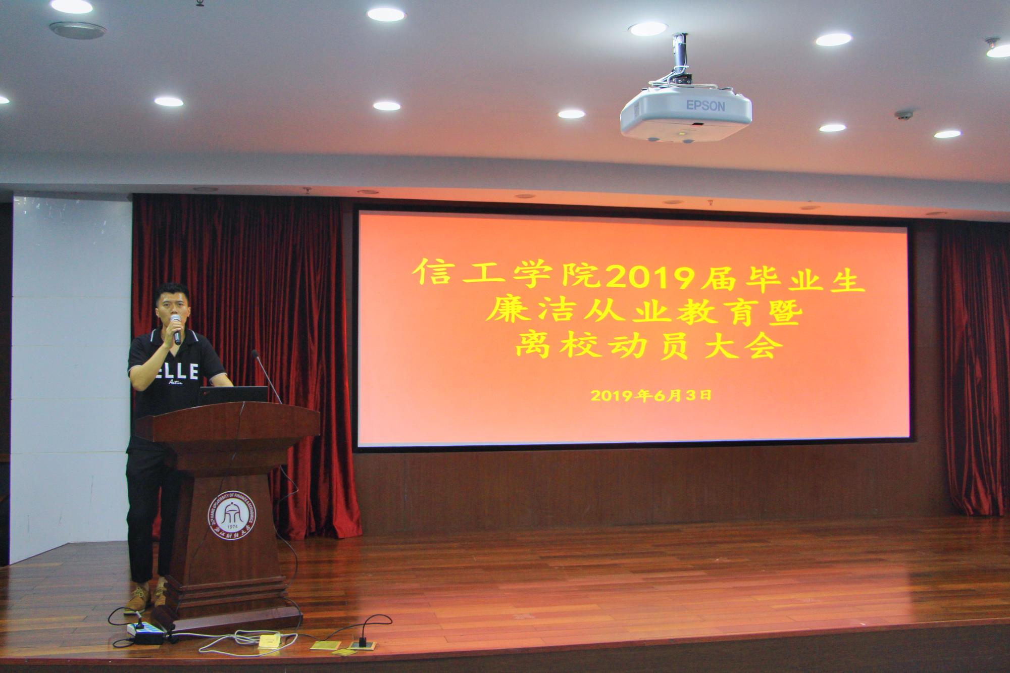 6月3日下午,伟德官网在学术四号报告厅举行2019届毕业生廉洁从业教育暨离校动员大会。出席本次大会的有学院党委副书记陆颋浩、学工办主任陈小芳、辅导员冯李哲、车鹏以及2019届全体毕业生。本次大会旨在为帮助毕业生安全、文明、顺利离校,同时为毕业生进行廉洁从业教育,坚定理想信念,增强廉洁从业意识,树立爱岗敬业观念,为毕业生上好最后一课。