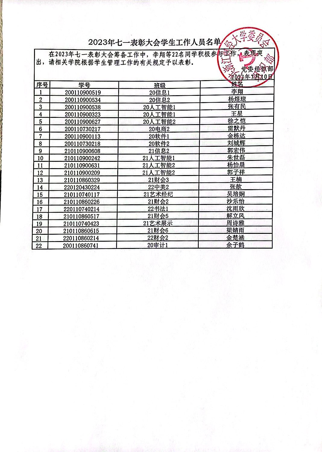 2023年6月29日,伟德官网圆满完成了学校“循迹溯源学思想 砥砺奋进建新功”七一表彰大会的承办工作。期间,李翔等22名同学担任学生工作人员,扎实工作,甘于奉献,表现突出,积极协助校党委组织部和学院党委完成大会的筹备和组织工作,大会得到学校领导和师生党员的广泛好评。经校党委组织部研究决定,对上述同学进行通报表扬,以资鼓励。名单如下: