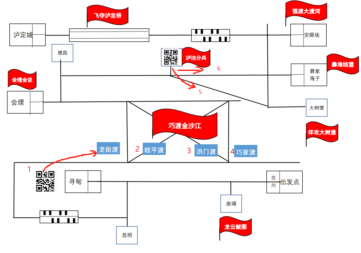 本次比赛要求考生设计和制作机器人软硬件系统,让机器人模拟红军长征,完成“巧渡金沙江-飞夺泸定桥”的任务。本次竞赛在2023年“重走长征路”机器人竞赛的基础上,加入图像识别、二维码识别等计算机视觉的内容,以特定任务的形式,要求机器人完成整个比赛。比赛时,机器人从“贵州”出发,经过云南地区的“曲靖”和“寻甸”,在“寻甸”扫描图片接收任务,根据任务(图像识别的结果)决定在龙街渡、皎平度、洪门渡和巧家渡等四个渡口中选择渡江点。机器人“巧渡金沙江”后,依次到达会理、德昌、泸沽,在“泸沽”扫描图片接收任务,根据任务指引选择“走”“大树堡”或“彝家海子”,真实还原红军长征时期的“泸沽分兵”的重要事件。机器人“泸沽分兵”后到达安顺场和泸定县城,整个路线再现了红军长征中的“龙云献图”、“巧渡金沙江”、“会理会议”、“泸沽分兵”、“强渡大渡河”、“飞夺泸定桥”等重要事件,以机器人重走长征路的新形式,完成长征壮举,传播长征精神,丰富新时期的党建教育形式。