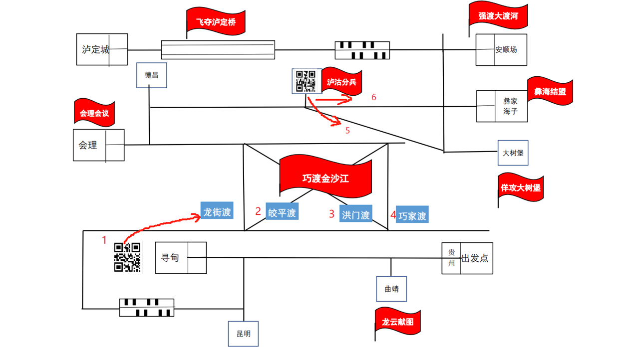 机器人从“贵州”出发,经过云南地区的“曲靖”和“寻甸”,在“寻甸”扫描图片接收任务,根据任务(图像识别的结果)决定在龙街渡、皎平度、洪门渡和巧家渡等四个渡口中选择渡江点。机器人“巧渡金沙江”后,依次到达会理、德昌、泸沽,在“泸沽”扫描图片接收任务,根据任务指引选择“走”“大树堡”或“彝家海子”,真实还原红军长征时期的“泸沽分兵”的重要事件。机器人“泸沽分兵”后到达安顺场和泸定县城,顺利完成重走长征路的壮举。