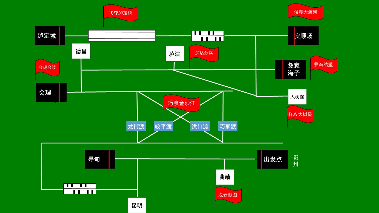 机器人从出发点(贵州)出发,途经云南曲靖、寻甸、昆明,在龙街渡、皎平度、洪门渡和巧家渡等金沙江主要渡口选择过江,到达会理、德昌、泸沽、大树堡、彝家海子、安顺场和泸定县,完成“龙云献图”、“巧渡金沙江”、“会理会议”、“泸沽分兵”、“佯攻大树堡”、“彝海结盟”、“强渡大渡河”和“飞夺泸定桥”等长征重要事件。