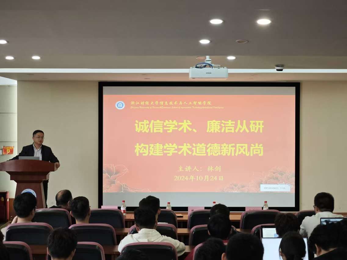 10月25日,伟德官网在9302会议室成功举办了主题为“诚信学术、廉洁从研—构建学术道德新风尚”的专题讲座。此次讲座由学院副院长林剑担任主讲人,特邀教授姚建荣,研究生秘书杨天亦,辅导员吴泽勇及2024级研究生参加本次活动。