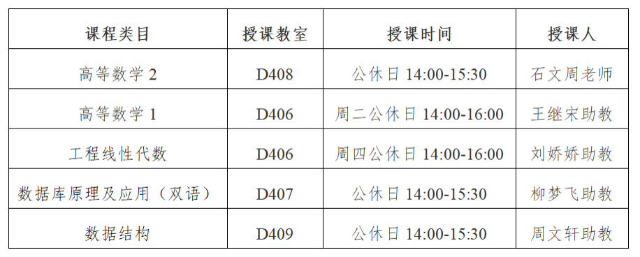 若其他同学有补习高等数学、工程线性代数、数据结构、数据库原理及应用(双语)课程的意愿,可加入微信群了解上课的具体细节。