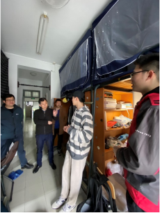 走访中,老师们对寝室卫生、安全用电、防范电信诈骗等工作进行了宣传排查。针对存在不足的寝室,老师们耐心地教育并提出整改建议。