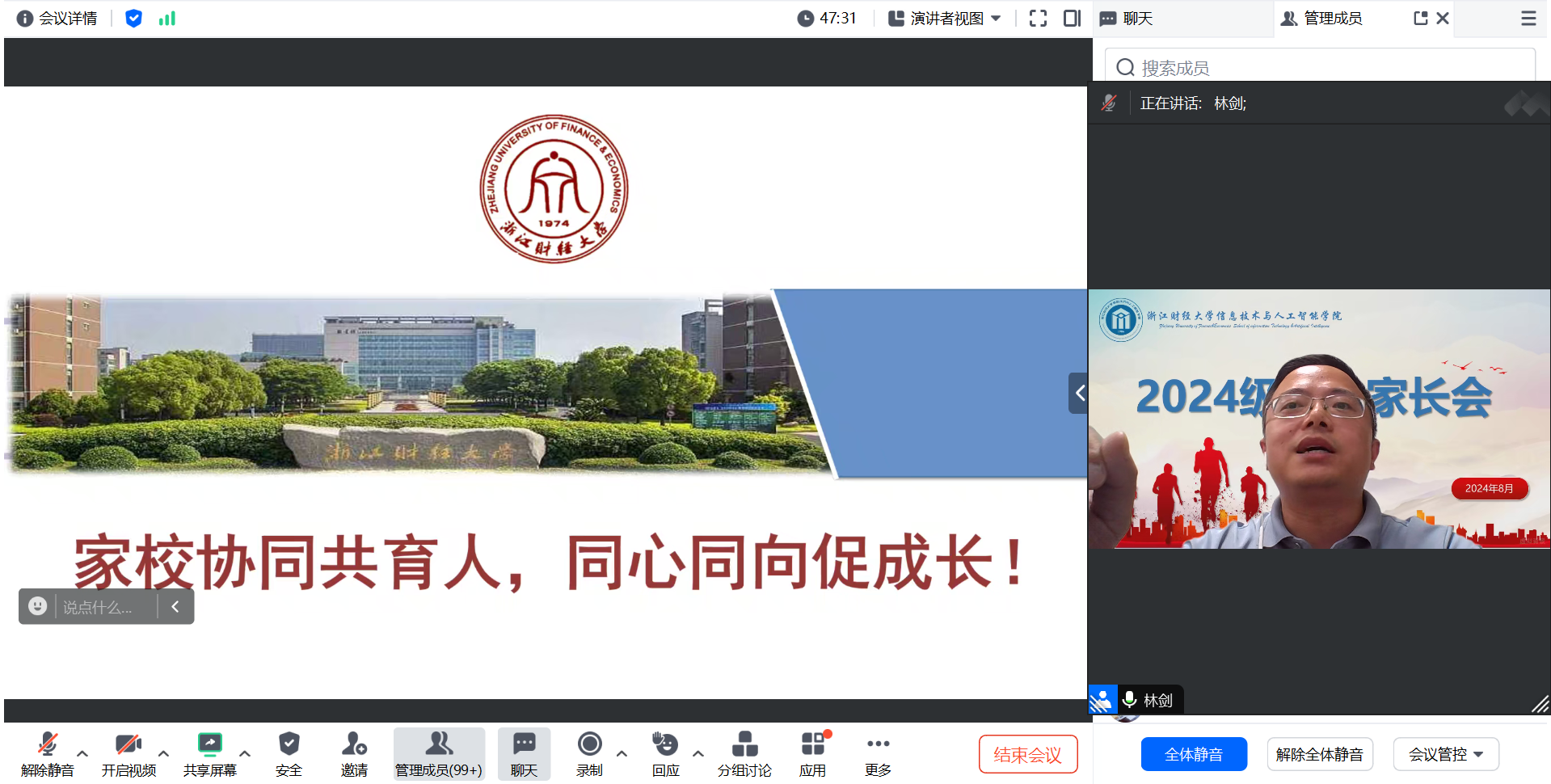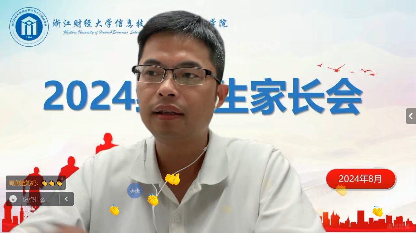 吴轶韵副书记向家长们介绍了我校学生管理制度和“新财经战略”背景下MAQ型“浙财金生”家校协同育人培养路径,并特别提醒临近的入学,开学各项注意事项。