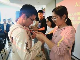 入党宣誓后,支部进行了庄重的党徽授予仪式。22位同志依次上台接受入党介绍人授徽,入党介绍人的殷殷嘱托传承着支部“奉献、务实、进取”的精神,更让每位同志都感受到了肩上的责任与使命。