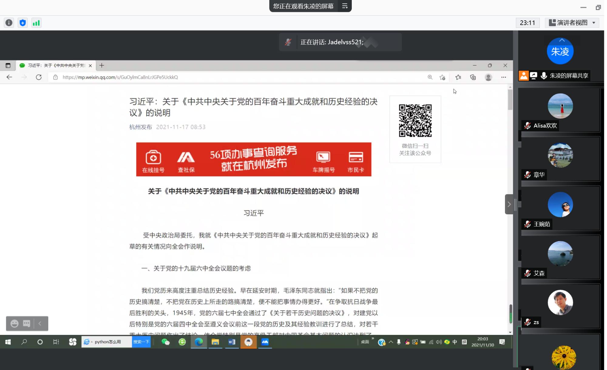 2021年11月30日,伟德官网教工第一党支部召开第一议题制度专题研究的线上学习会。学院院长张帅及支部党员参加会议,会议由支部书记朱凌主持。支部党员集体学习贯彻全省基层党建工作会议精神、谋划实施“红色根脉强基工程”的政策举措,以及党的十九届六中全会精神。