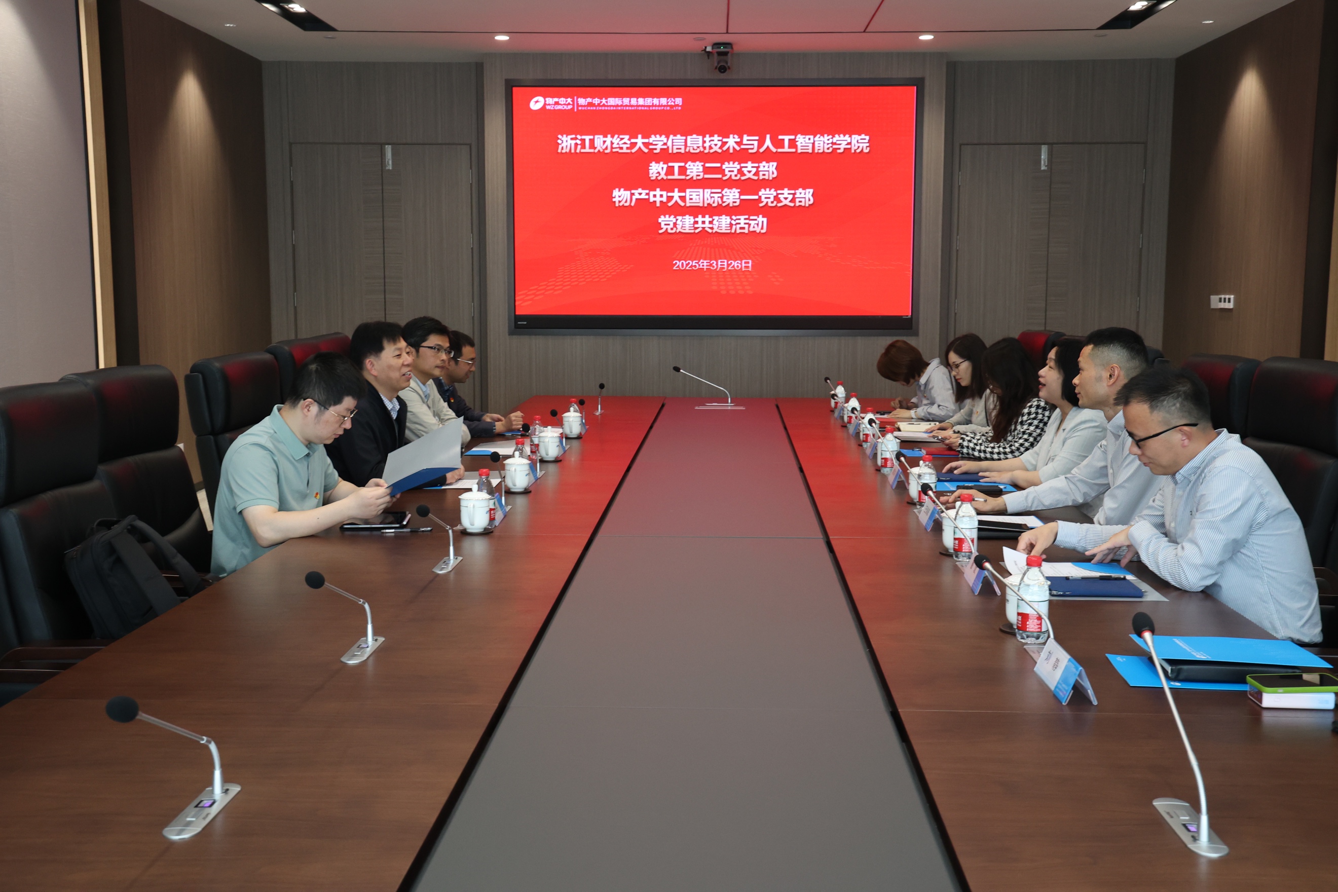 葛书记对学院一行的到访表示热烈欢迎,并介绍了公司发展历程和改革创新情况。张院长介绍了学院专业建设、学生就业等情况,吴书记介绍了学院党建工作情况。学院教工第二党支部与物产中大国际第一党支部签订支部共建协议,双方就党建共建、校企合作等方面进行了交流研讨。