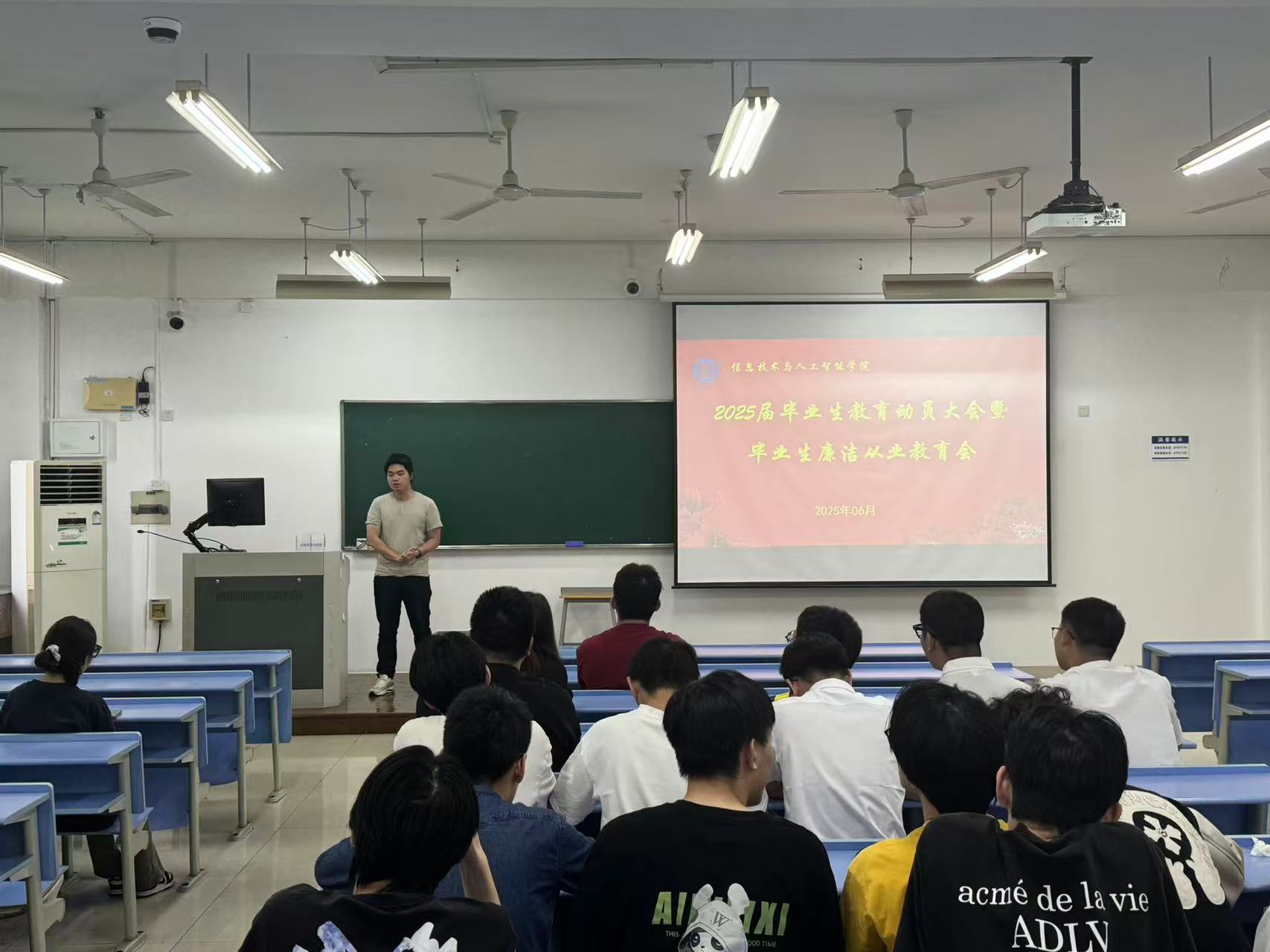 在毕业相关事宜板块,带班辅导员吴泽勇进行了人事档案转接科普,他围绕档案的重要性、转接流程以及常见问题,为同学们上了一堂干货满满的档案知识课;学办主任洪宝华则带来就业提示与就业安全提醒,从求职渠道甄别、劳动合同签订到职场安全防范等方面,全方位为毕业生的就业之路保驾护航。
