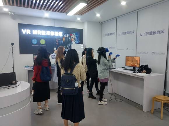 在教育部“AI+智慧学习”共建人工智能学院和中央财政资助项目“人工智能AI+应用创新实验室”的支持下,2019年伟德官网在创业学院楼1楼西建设人工智能体验园,占地面积204平方,设备价值近120万元。目前,人工智能体验园由视频展示介绍区、机器感知区、互动体验区、机器执行区、虚拟现实区、综合应用区和互动体验区等六部分构成。拥有语音识别演示系统、视频融合演示系统、人脸融合展示系统、图像风格转移系统、可视化神经网络演示系统、六轴视觉机械臂、人机对弈棋盘、车载视觉防卫系统、激光雷达车载套件、虚拟现实解决方案、增强现实解决方案、互动编程试验箱等设备。