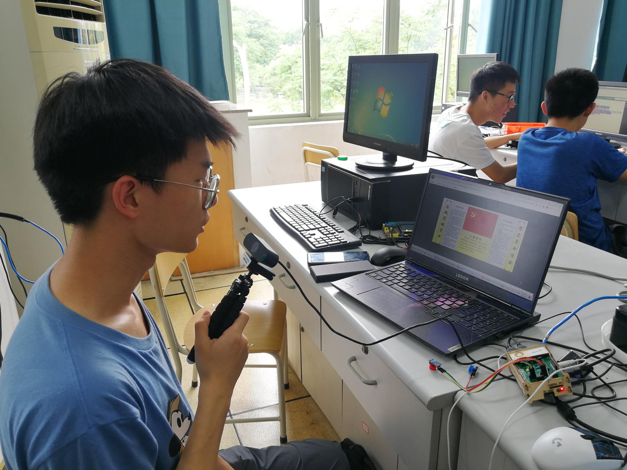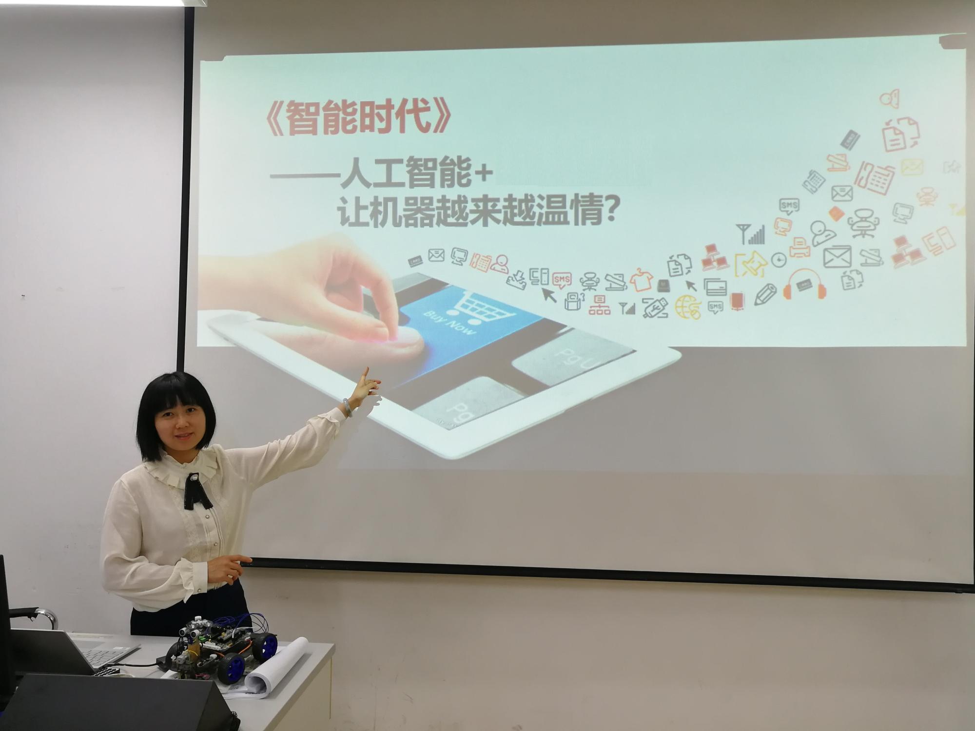 朱凌老师还教导同学们使用语音识别和机器翻译技术将入党誓词的朗读版转换成中英文两个不同的文字版,同时在树莓派中写入程序,通过机器人播放红色歌曲,悠扬的歌声从《智能时代》的课堂中传出,振奋人心。