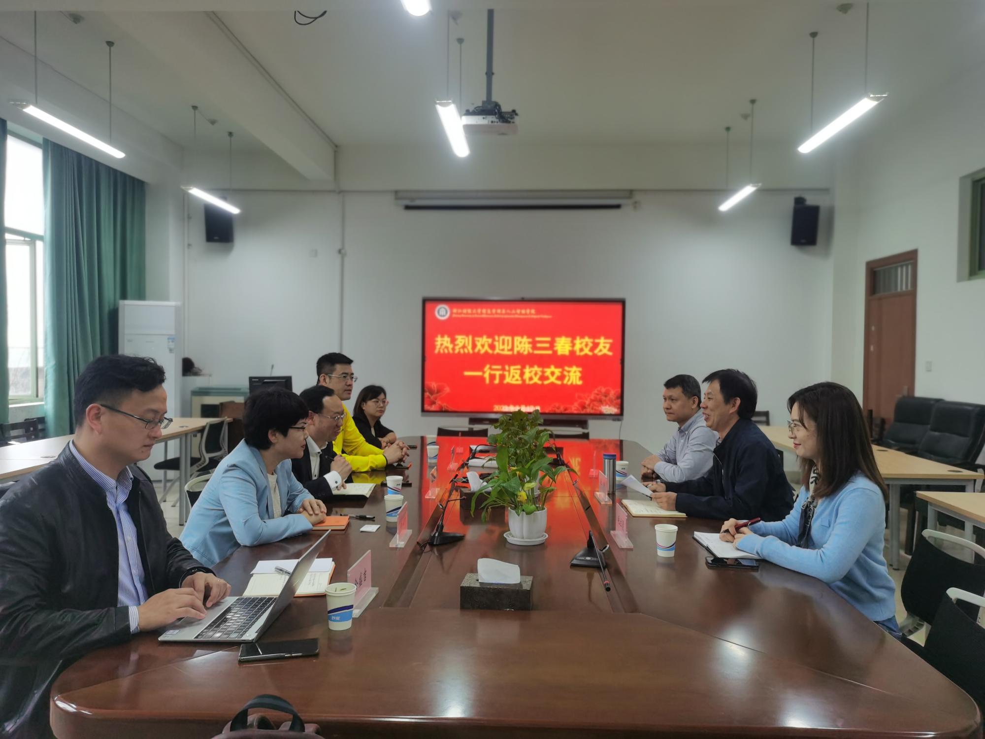 张帅院长对陈三春校友一行此次来访表示欢迎,简要介绍了学院的办学概况、专业设置、科研成绩等情况,张文宇教授举例了目前校企合作项目及成果。