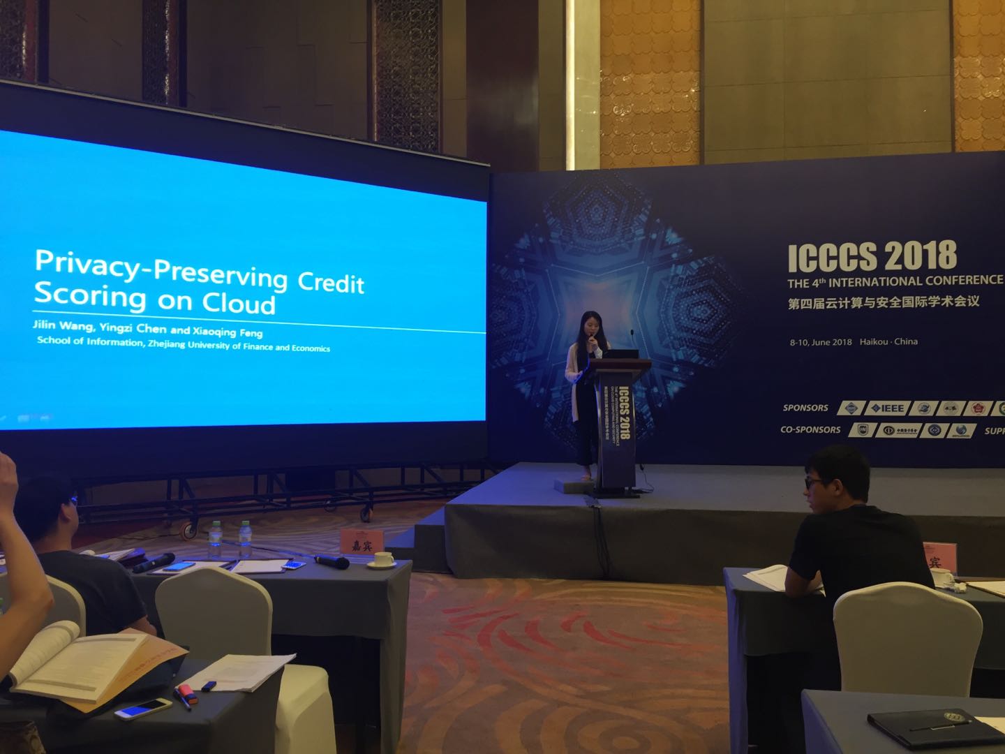 2018年6月8日-10日,由南京信息工程大学等举办的第四届云计算与安全国际会议(ICCCS2018)在中国海南省海口市顺利举行。云计算与安全国际会议(International Conference on Cloud Computing and Security,ICCCS)自2015年发起以来,已成功举办三届,现已成为国际知名的大型学术盛会。大会旨在为国内外从事计算机领域研究和工程技术的专家、学者、学生及技术人员,提供一个交流最新学术成果、探讨学术前沿问题的平台。本次会议聚集了来自中国、美国、俄罗斯、日本、法国、加拿大、意大利等世界各国的700多名专家学者,共同就云计算、信息隐藏、物联网安全、多媒体应用等问题展开探讨。伟德官网16级企业管理专业研究生陈英姿参加了此次国际会议并在其分论坛就“Privacy-Preserving Credit Scoring on Cloud”主题做会议报告,并与专家学者们进行深入的交流和讨论。