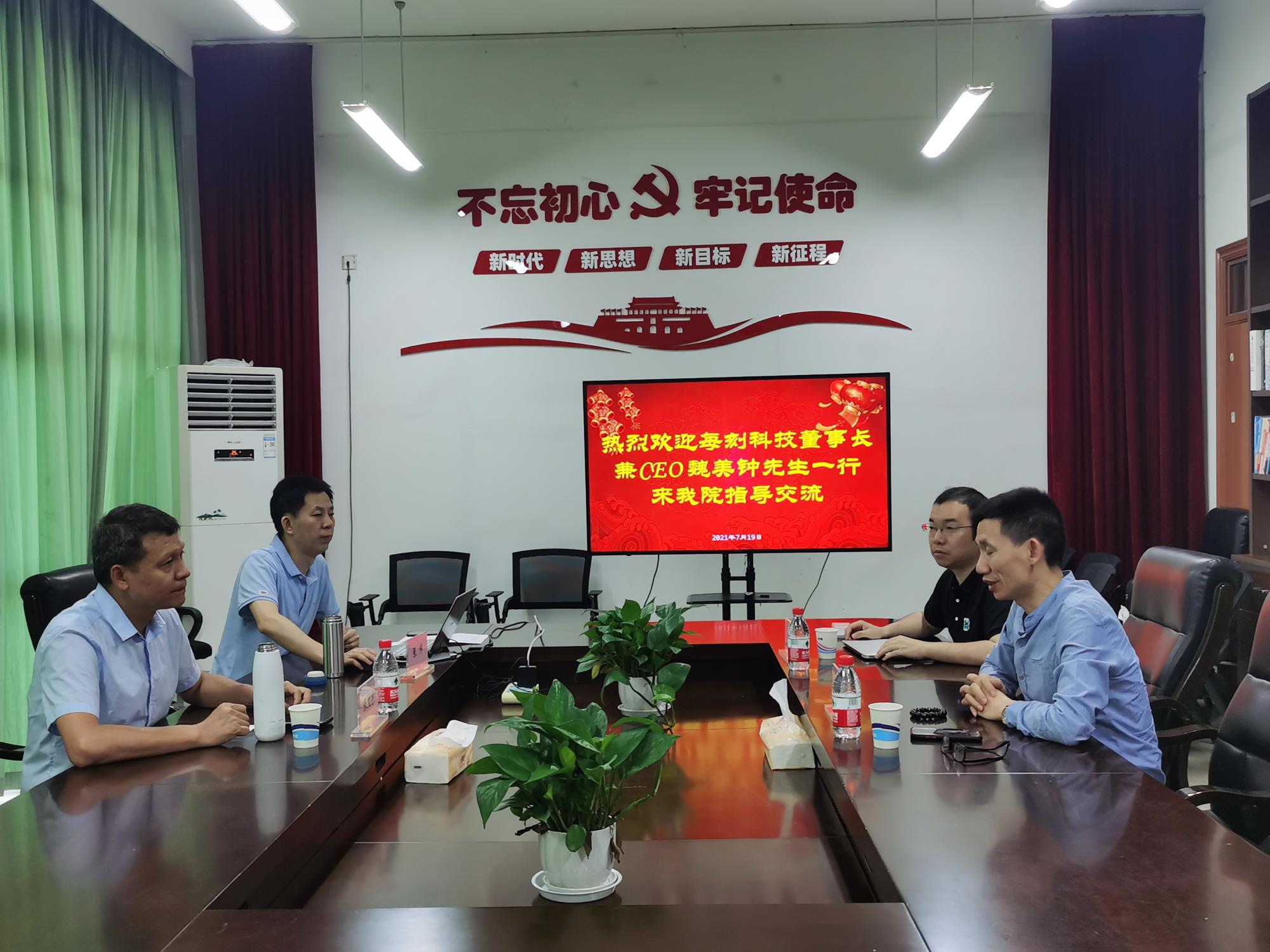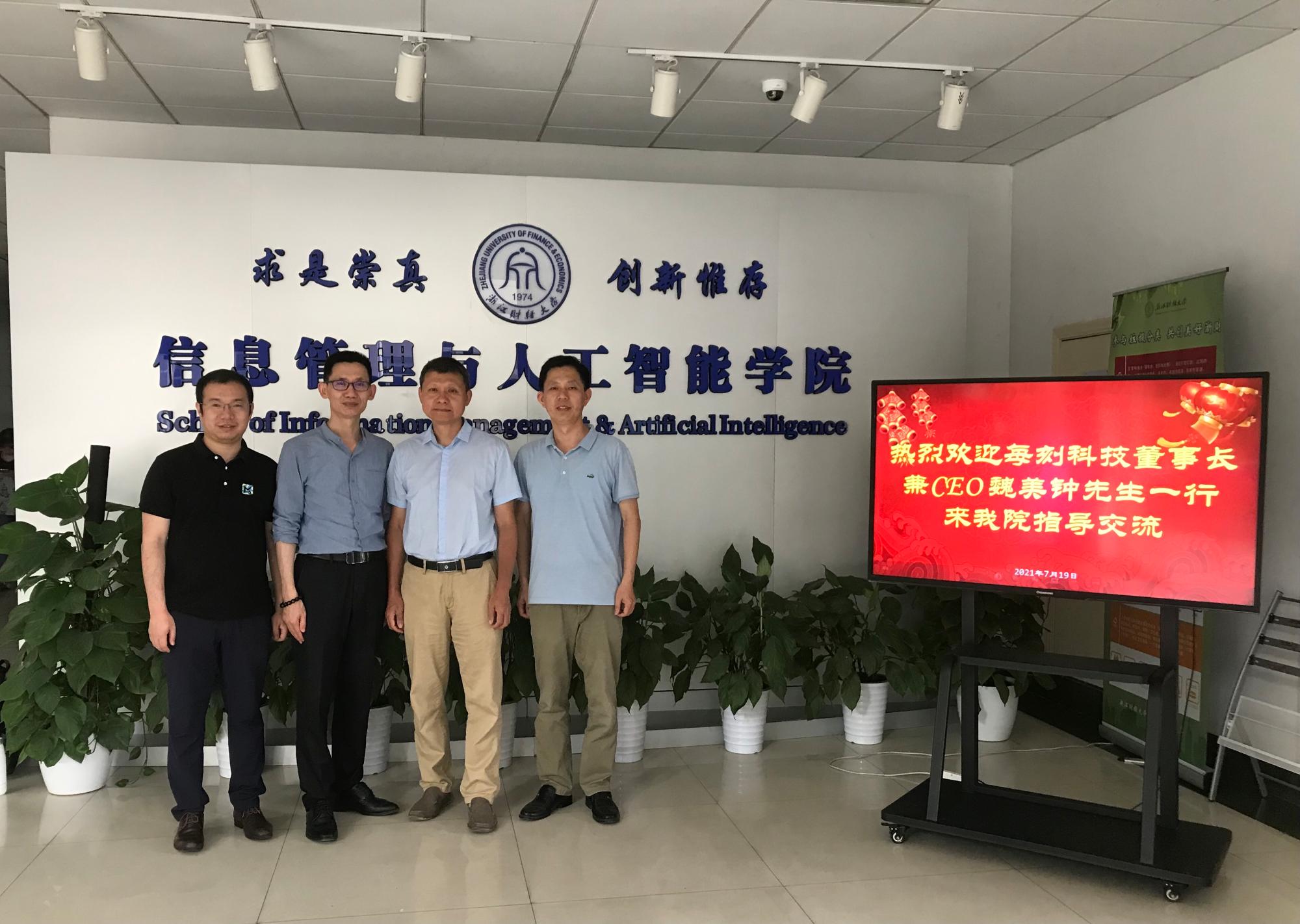 2021年7月19日下午,每刻科技公司董事长兼CEO魏美钟、联合创始人周军赞一行来伟德官网洽谈人工智能校企合作事宜。学院院长张帅、人工智能研究院院长张文宇热情的接待了魏美钟一行。