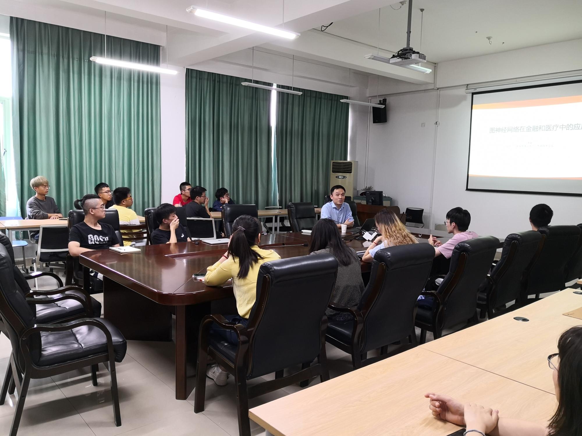 李朝博士首先给大家介绍了机器学习领域中的图神经网络方法,并讲解了图神经网络方法在金融和医疗领域中的应用情况。在后续的讨论环节中,李朝博士详细解答了同学们在人工智能学习中遇到的各种问题,为产学研服务提出了一些思路,对伟德官网人工智能专业建设提供了许多宝贵的建议。两位老师还与李朝博士就后续的合作研究进行了讨论。