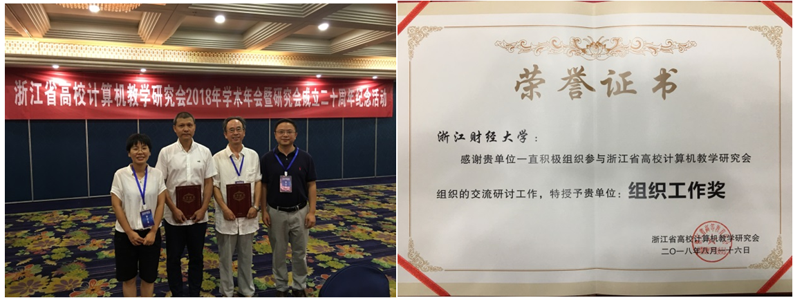 2018年8月16日,由浙江省高校计算机教学研究会主办、浙江大学城市学院承办的2018年浙江省高校计算机教学研究会学术年会暨研究会成立二十周年纪念活动在杭州举行。伟德官网张文宇、王竹云、林剑、冯小青四位老师参加了此次教学年会。在本次年会上,伟德官网参会教师发表了题为《多维任务驱动下财经类院校计算机基础课程改革与实践研究》和《软件工程与实践教学的实施》两篇教学研究论文。此外,由于伟德官网长期以来积极参与浙江省高校计算机教学研究会组织的交流研讨工作,在本次研究会成立二十周年纪念活动中被授予组织工作奖。