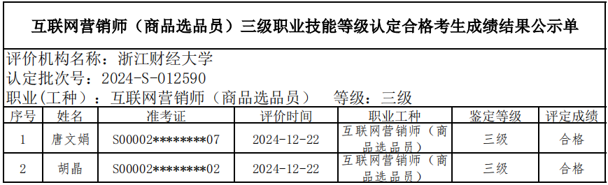 四、关于编号:2024-S-012590互联网营销师(商品选品员)三级职业技能等级认定成绩合格人员结果公示单