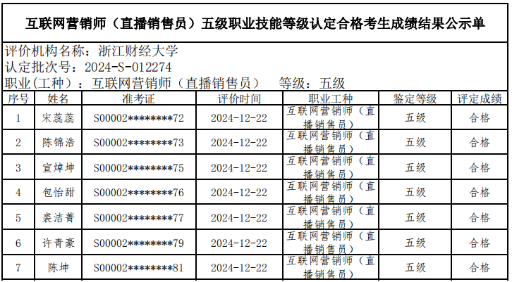 五、关于编号:2024-S-012589互联网营销师(商品选品员)四级职业技能等级认定成绩合格人员结果公示单