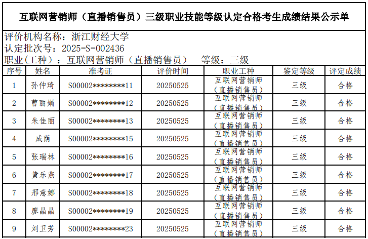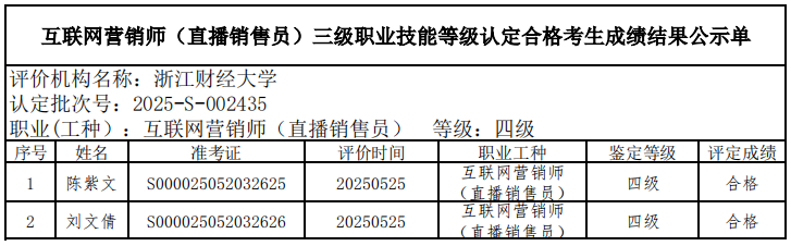 二、关于编号:2025-S-002435互联网营销师(直播销售员)四级职业技能等级认定成绩合格人员结果公示单